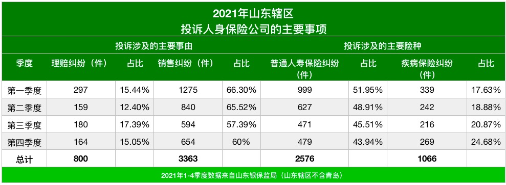 在涉及人身保险公司的投诉中,投诉事由主要集中在销售纠纷,全年累计3363件,占到投诉事由的六成左右;其次是理赔纠纷,全年累计800件。数据显示,2021年山东辖区4个季度人身保险销售纠纷分别达1275件(占比66.3%)、840件(占比65.52%)、594件(占比57.39%)、654件(占比60%)。