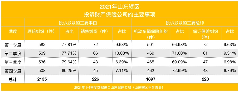 不同于人身保险,财产保险公司所涉及的投诉中,投诉事由以理赔纠纷为主,全年累计2135件,占比近八成。据统计,2021年山东辖区4个季度理赔纠纷分别582件、509件、536件、508件,分别占财产保险公司投诉总量的77.81%、77.71%、79.64%、80.25%。销售纠纷在财产保险公司所涉及的投诉中占比不足一成,去年全年累计226件。